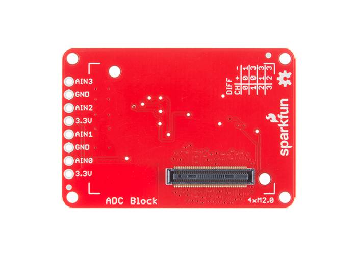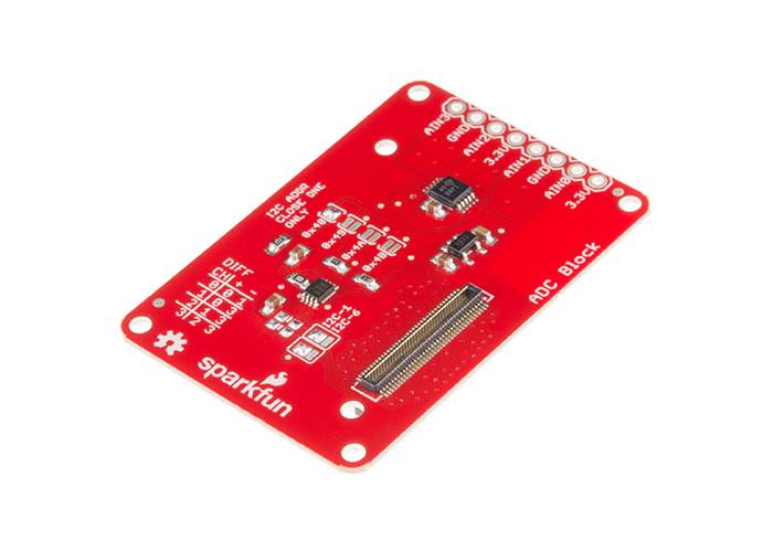 The ADC Block has jumpers to allow selection of the I2C slave address among four different options, allowing up to four of these cards to be stacked under one Edison. The sampling rate is not sufficient for audio capture, at 2.2kHz, but it should be adequate for most control applications. This version also adds a 3.3V output to use as a voltage reference and a solder jumper to select between I2C1 and I2C6.