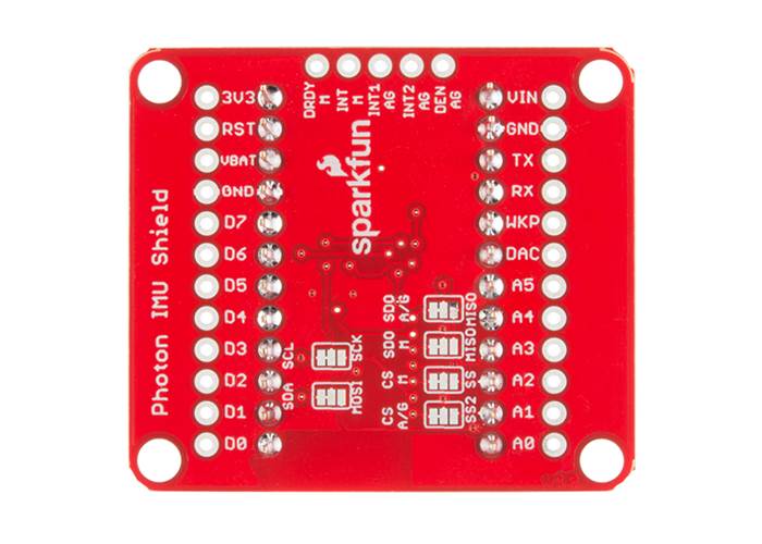 Each sensor in the LSM9DS1 supports a large variety of ranges: the accelerometer’s scale can be set to ± 2, 4, 6, 8, or 16 g, the gyroscope supports ± 245, 500, and 2000 °/s, and the magnetometer has full-scale ranges of ± 2, 4, 8, or 12 gauss. The SparkFun Photon IMU Shield comes with the headers already soldered on, so you can plug and play!