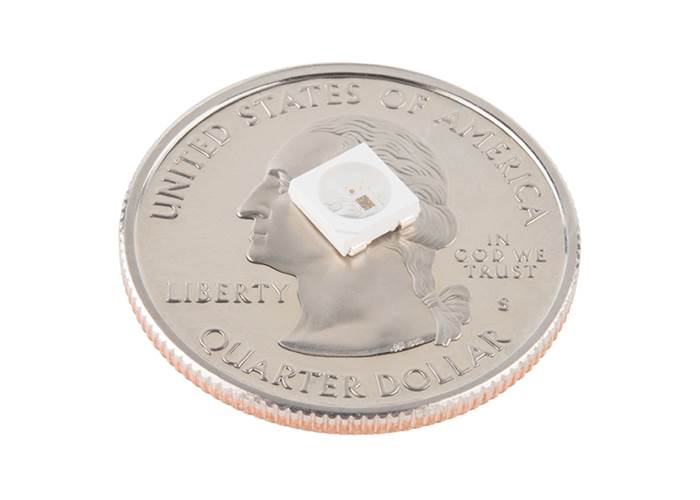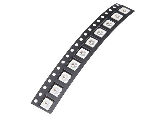 The WS2812B may look like a common 5050-sized (5x5mm) SMD LED, but there’s actually an integrated control circuit embedded inside there too. If you look really hard, you can see the tiny black chip hidden in there, along with minuscule gold wires connecting the chip to the LED.