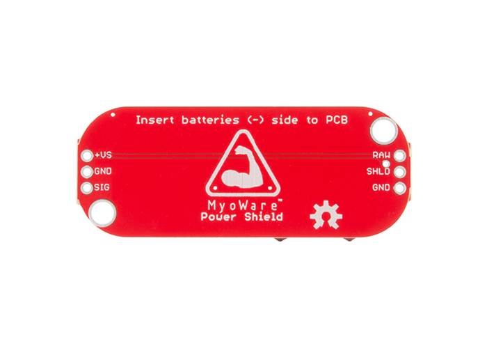 The MyoWare Power Shield is designed to take two standard CR2032 coin cell batteries to power the MyoWare Muscle Sensor. We have made this board in a way that the coin cell batteries are connected in parallel for extended capacity at a nominal 3.0V. Connecting the MyoWare Muscle Sensor to battery power allows for a cleaner signal while also eliminating the possibility of creating a dangerous current path to the power grid.