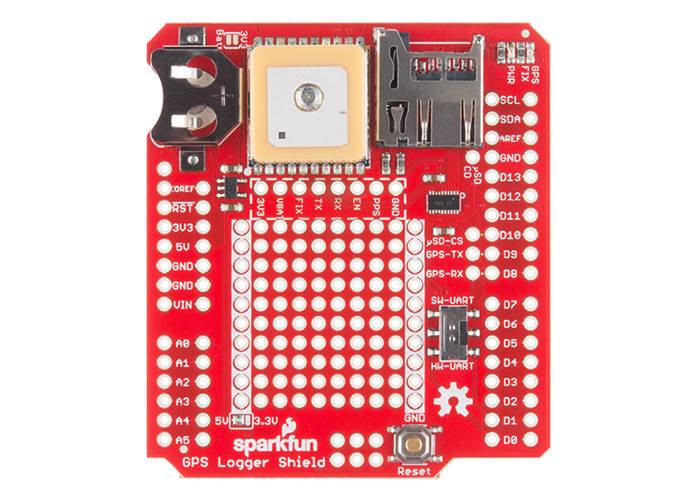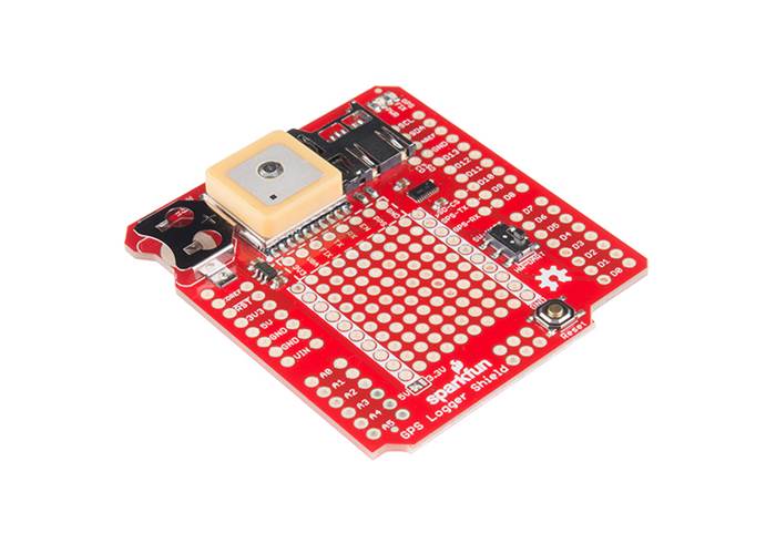 The SparkFun GPS Logger Shield equips your Arduino with access to a GPS module, µSD memory card socket, and all of the other peripherals you’ll need to turn your Arduino into a position-tracking, speed-monitoring, altitude-observing wonder logger.