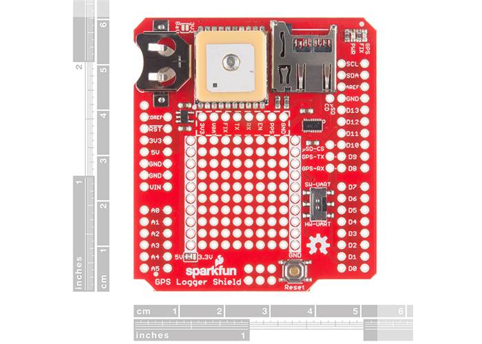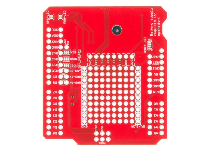 Everything on the shield is highly configurable: A switch allows you to select the GPS module’s UART interface between either hardware or software ports, the µSD card operates over a hardware SPI port, which should be compatible with most Arduino layouts, and extra prototyping space should allow you to add those last, few components you need to complete your project. The GPS Logger Shield’s main voltage supply is taken from the Arduino 5V header pin. This voltage is regulated down to 3.3V, which is supplied to both the GPS module and the µSD card. These two components should consume, about 30mA on average, but they may very occasionally spike to around 100mA. We also highly recommend a 12mm Coin Cell Battery, which fits into the GPS Shield’s battery holder.