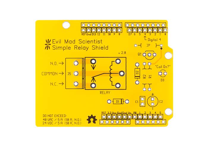 This Relay Shield v2.0 from Evil Mad Scientist is a simple Arduino add-on that gives your Arduino the ability to control a single electromechanical relay for switching loads of up to 24VDC or 40VAC.