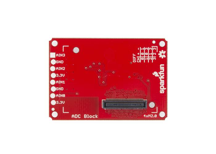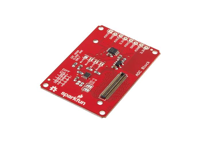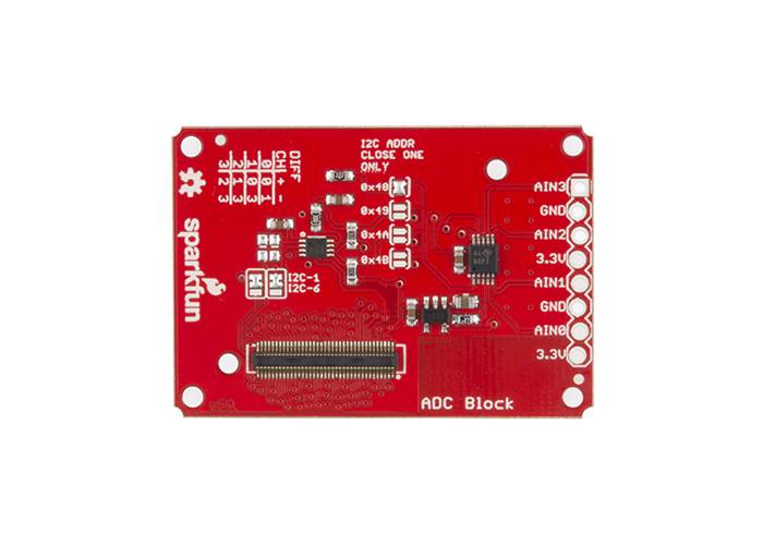 The ADC Block has jumpers to allow selection of the I2C slave address among four different options, allowing up to four of these cards to be stacked under one Edison. The sampling rate is not sufficient for audio capture, at 2.2kHz, but it should be adequate for most control applications. This version also has a 3.3V output (now with less noise on the line) to use as a voltage reference and a solder jumper to select between I2C1 and I2C6.