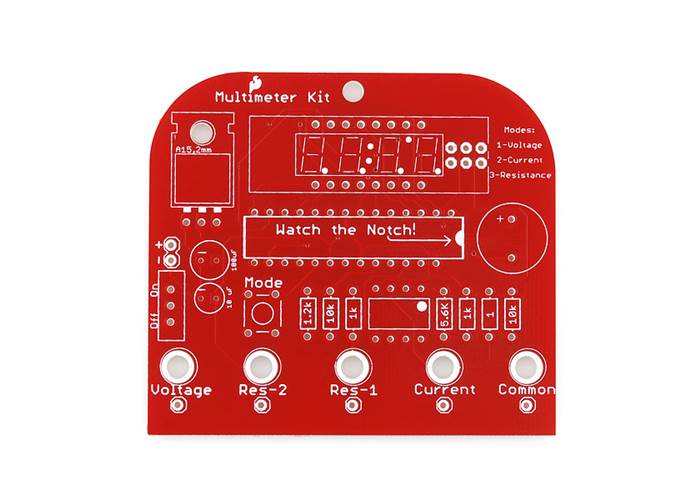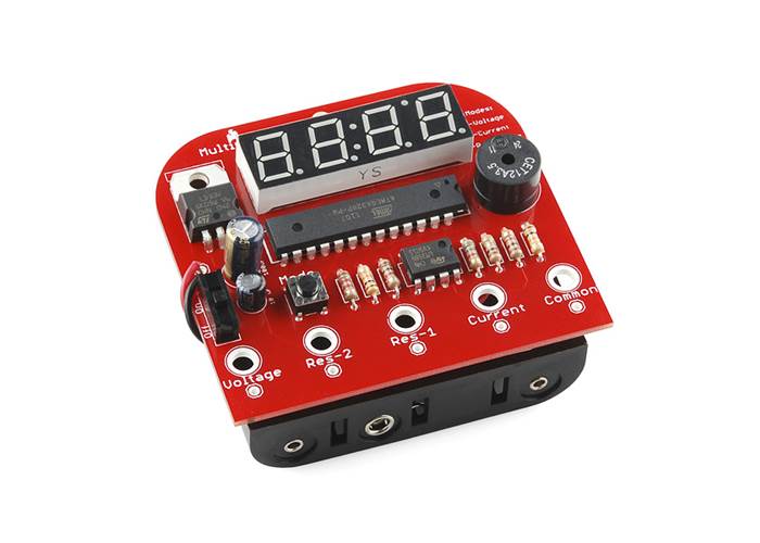 The Multimeter Kit provides you with everything you need to make your own multimeter capable of measuring voltage (0-30VDC, 0.05 resolution) current (0-500mA, 1mA resolution) and resistance (0-100kΩ).