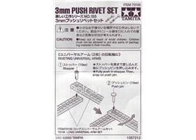 The Tamiya 70155 3 mm Push Rivet Set includes 48 push rivets (3 x 10 mm). Each reusable rivet consists of a push pin that gets inserted into a stopper that is compatible with the 3 mm hole size on multiple Tamiya products. The rivets are easily added or removed and can connect parts or be used as joints as illustrated in the instructions shown here.
