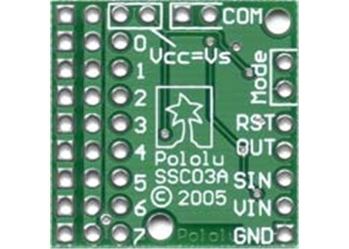 The Pololu micro serial servo controller (SSC) is a very compact solution for controlling up to eight radio control (RC) servos from a computer or microcontroller. The controller measures just 0.91" x 0.91", yet it is one of the most full-featured servo controllers available. Each servo speed and range can be controlled independently, the baud rate is detected automatically over a 1200-38400 bps range, and multiple units can be daisy-chained on one serial line to control up to 128 servos. Three status LEDs and an integrated level converter for RS-232 applications get you up and running quickly. The micro serial servo controller is dwarfed by even a standard servo, but it can control any standard RC servo, including giant 1/4-scale servos.