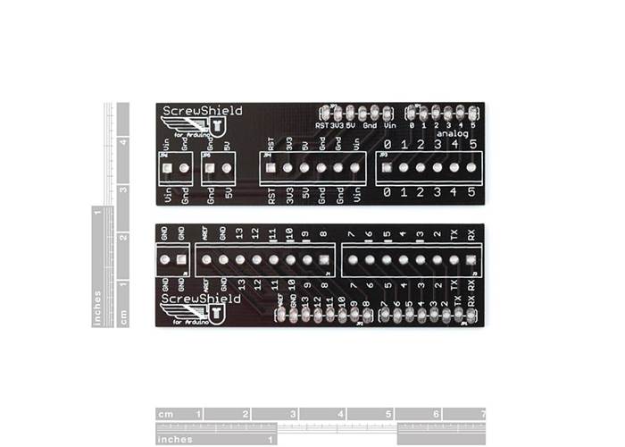 The ScrewShield extends all pins of the Arduino out to 3.5mm pitch screw terminals. Both sides of the shield are broken out to the side of the Arduino, to allow access to everything on the main Arduino board. Stacking headers are also included so you can pile more shields on top.