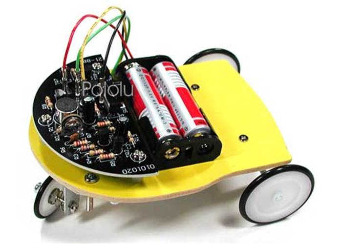 This kit is a low-cost implementation of the common introductory robot that backs up and turns when it hears a sound or hits an obstacle. The kit is quite basic, but because the instructions do not provide soldering instructions, we recommend this kit for someone who has completed at least one previous soldering project.