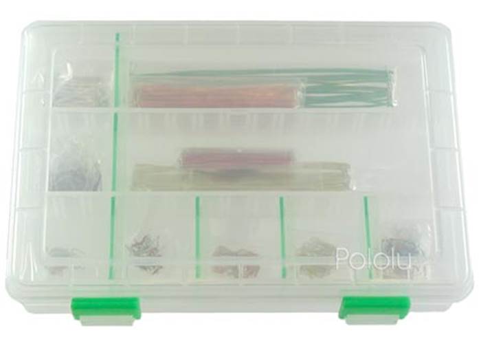 This wire kit contains 25 pieces of each of 14 different lengths in a case that has adjustable compartments and two secure latches. The compartment bottoms are rounded for easy retrieval of small wires or components. The adjustable parts box by itself is also available separately.