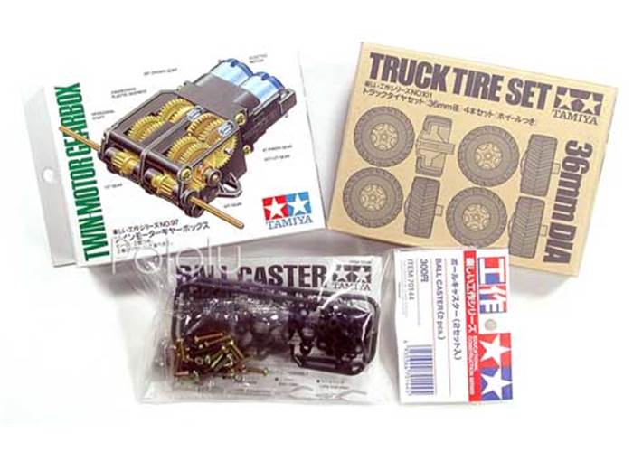 This discounted combination of Tamiya’s twin-motor gearbox , ball castor , and truck tires is meant for use with one Pololu round robot chassis .