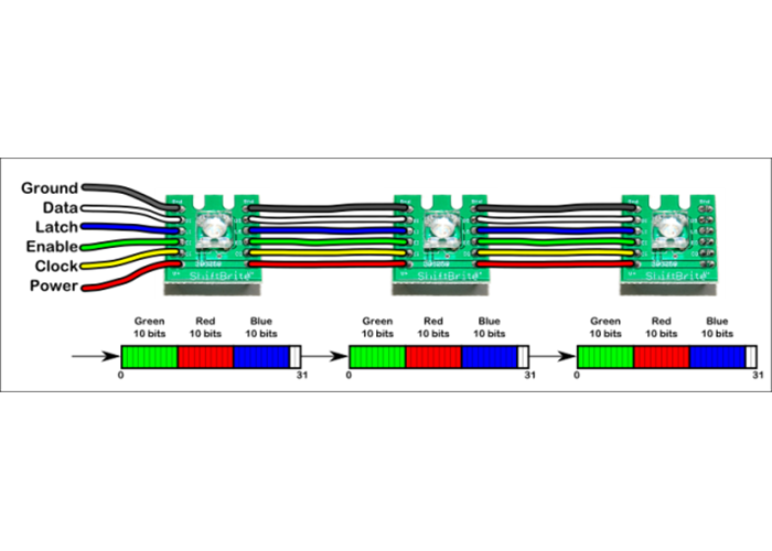 These 12" (30 cm), six-conductor cables can be used to chain together ShiftBrite or ShiftBar modules. The cable wires are coloured to match the ShiftBrite pin-out, with black for ground and red for power.