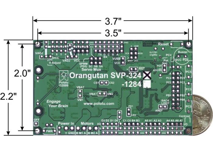 The Orangutan SVP robot controller is a complete control solution for small and medium-sized robots running at 6 – 13.5 V. The module is designed around the powerful Atmel ATmega324PA AVR microcontroller (32 KB flash, 2 KB RAM, and 1 KB EEPROM) or ATmega1284P (128 KB flash, 16 KB RAM, and 4 KB EEPROM) running at 20 MHz and features a full complement of peripheral hardware to support robotics applications. For a detailed description of the Orangutan SVP’s capabilities, please see the product page for the fully assembled SVP-324 or fully assembled SVP-1284.