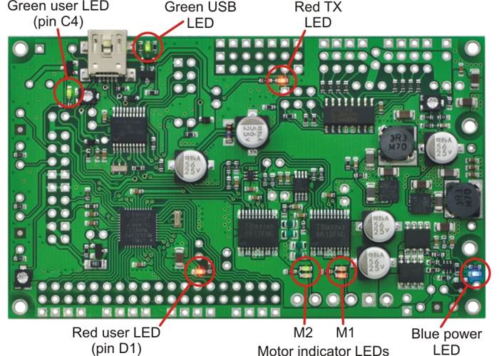 The Orangutan SVP partial kit PCB has all of the surface-mount components pre-soldered, as shown to the right, and the kit includes the following through-hole components so that you can customise the robot controller to your particular application: