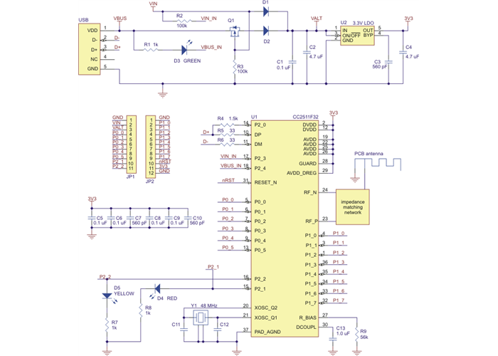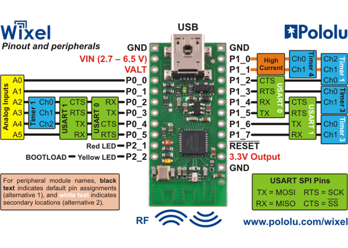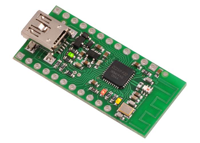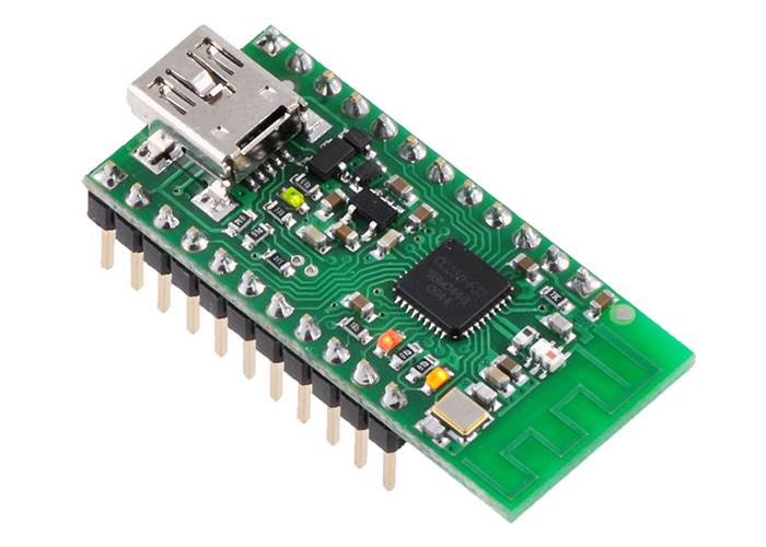 The Pololu Wixel is a general-purpose programmable module featuring a 2.4 GHz radio and USB. The Wixel is based on the CC2511F32 microcontroller from Texas Instruments, which has an integrated radio transceiver, 32 KB of flash memory, 4 KB of RAM, and a full-speed USB interface. A total of 15 general-purpose I/O lines are available, including 6 analogue inputs, and the 0.1" pin spacing makes the Wixel easy to use with breadboards and perfboards. These features give you three main ways to use this general-purpose module: