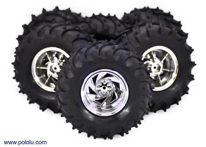 The higher gear ratio version has a lower top speed but can produce greater torque. Note that while the Wild Thumper chassis includes six wheels, the wheels can be purchased in pairs for use as replacement Wild Thumper parts or as wheels for custom chassis. The wheels are available with metallic-red hubs and chrome-coloured hubs. We also offer the Wild Thumper gearmotors individually in a wide range of gear ratios (versions with integrated quadrature encoders are also available, though these will not work with the Wild Thumper chassis).
