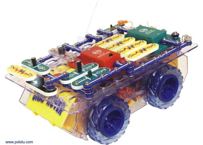 The RC Snap Circuits Rover is a mobile, radio-controlled Snap Circuits platform. Build the 23 included projects and create many of your own circuits with the ample circuit-building space on top of this four-wheeled chassis.