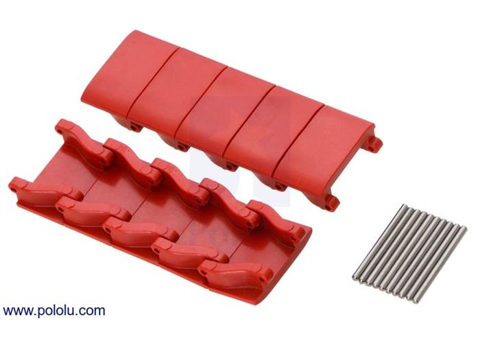 These miniature tank tracks are great for small, indoor, tracked robots. Each track link is injection-molded from ABS, and the links are held together by 1/16″ stainless steel dowel pins. The track is 0.9″ wide, and the pins are spaced approximately 0.54″ apart. These tank tracks are smooth for operation on one of the most common types of terrain that your robot might encounter: carpet! The tracks are designed to work injection-molded sprocket sets that allow for a variety of actuator options: