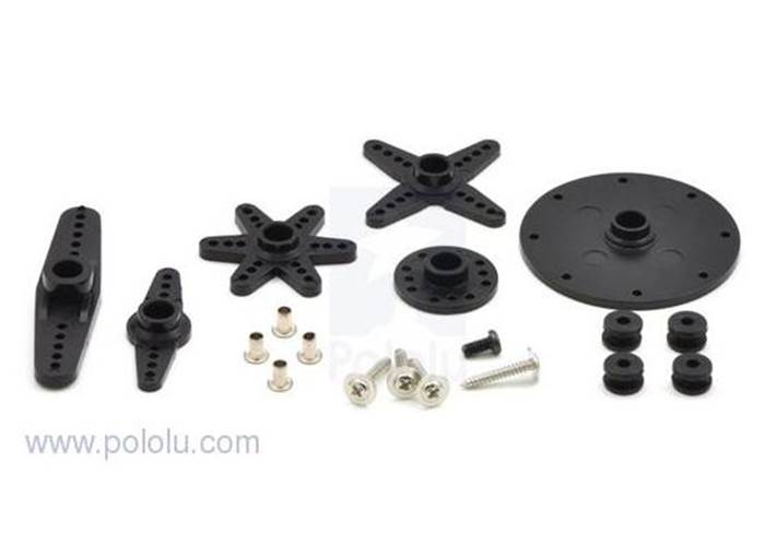 The HD-1501MG is a great high-quality, standard-size servo that features metal gears and two ball bearings and can deliver a tremendous amount of torque for a servo this fast. A replacement for the Power HD HD-2550A, it represents a significant performance upgrade for an even lower price. The picture below shows the hardware included with this servo. You can find more information about this servo under the specifications tab.