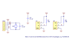 The sensors are powered through the VCC and GND pins. VCC can be 2.7 V to 18 V, and the quadrature outputs A and B are digital signals that are either driven low (0 V) by the sensors or pulled to VCC through 10 kΩ pull-up resistors, depending on the applied magnetic field. The sensors’ comparators have built-in hysteresis, which prevents spurious signals in cases where the motor stops near a transition point.