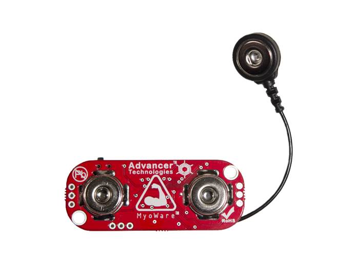 The MyoWare Muscle Sensor from Advancer Technologies measures, filters, rectifies, and amplifies the electrical activity of a muscle and produces an analogue output signal that can easily be read by a microcontroller, enabling novel, muscle-controlled interfaces for your projects.