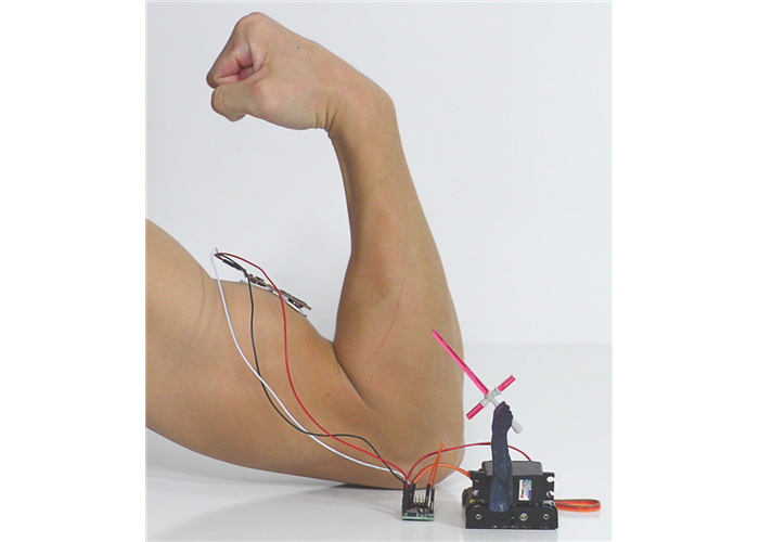 This muscle sensor from Advancer Technologies measures a muscle’s activity by monitoring the electric potential generated by muscle cells. This is referred to as electromyography (EMG). The sensor amplifies and processes the complex electrical activity of a muscle and converts it into a simple analogue signal that can easily be read by any microcontroller with an analogue-to-digital converter (ADC), such as an A-Star or Arduino – or even a Maestro servo controller like we show in this blog post. As the target muscle group flexes, the sensor’s output voltage increases. The exact relationship between the output voltage and the muscle activity can be fine-tuned using an on-board gain potentiometer.