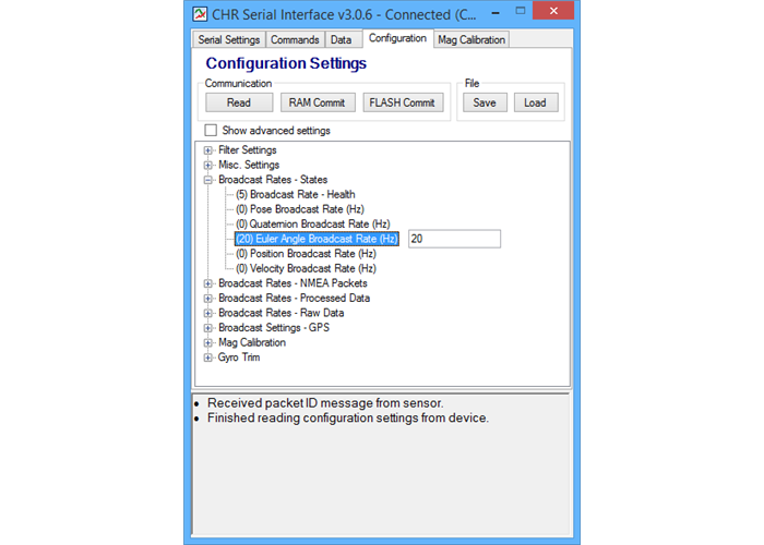 • Connects to the CHR Serial Interface software to allow for real-time plotting of sensor data, logging, device configuration, and magnetometer calibration