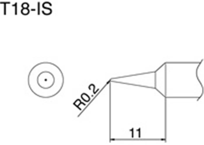This Hakko T18-IS Soldering Tip is a conical- or pencil-type with a tip radius of 0.2 mm and length of 11 mm. The diagram below shows the dimensions (in mm) of the T18-IS Soldering Tip.