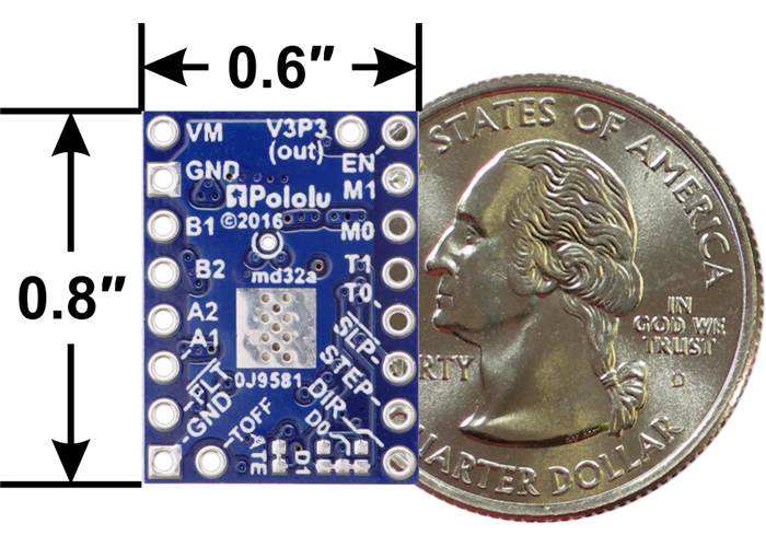 This product is a carrier board or breakout board for TI’s DRV8880 low-voltage stepper motor driver; we therefore recommend careful reading of the DRV8880 datasheet (2MB pdf) before using this product. This stepper motor driver lets you control one bipolar stepper motor at up to 1.6 A output current per coil (see the Power Dissipation Considerations section below for more information). Here are some of the driver’s key features: