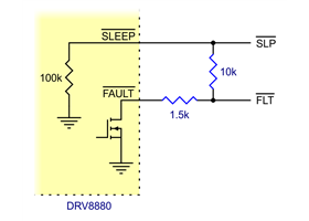 The DRV8880 also features a FAULT output that drives low whenever the H-bridge FETs are disabled as the result of over-current protection or thermal shutdown, or while the undervoltage lockout is disabling the chip. The carrier board connects this pin to the SLEEP pin through a 10k resistor that acts as a FAULT pull-up whenever SLEEP is externally held high, so no external pull-up is necessary on the FAULT pin. Note that the carrier includes a 1.5k protection resistor in series with the FAULT pin that makes it is safe to connect this pin directly to a logic voltage supply, as might happen if you use this board in a system designed for the pin-compatible A4988 carrier. In such a system, the 10k resistor between SLEEP and FAULT would then act as a pull-up for SLEEP, making the DRV8880 carrier more of a direct replacement for the A4988 in such systems (the A4988 has an internal pull-up on its SLEEP pin). To keep faults from pulling down the SLEEP pin, any external pull-up resistor you add to the SLEEP pin input should not exceed 4.7k.
