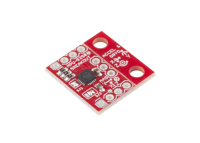 The SparkFun MPU-9250 IMU Breakout features the latest 9-axis MEMS sensor from InvenSense. Each of these 9DoF breakouts feature an MPU-9250 with a System in Package (SiP) that combines two chips: the MPU-6500, which contains a 3-axis gyroscope as well as a 3-axis accelerometer, and the AK8963, which features a 3-axis magnetometer. This breakout has been designed to be smaller than some of our other offerings to fit in smaller projects. However, if you plan to use a breadboard, or secure the IMU board to a project with something like epoxy, the mounting holes can be easily snapped off.