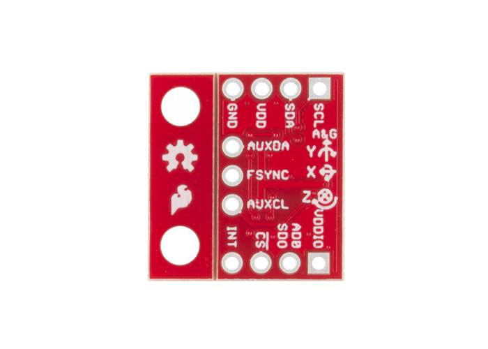 To achieve its smaller size, the MPU-9250 Breakout features PTH pins that have been wrapped around the border of the PCB in three rows of three or four. The top row (J1) is all one needs to get the most functionality out of the IMU. These include the I2C and power interface. The second most likely to be used set of PTHs are found along the bottom (J3). This includes the address pin, the interrupt pin, and the IO voltage supply for easy interface with a more modern 1.8V processor. The third, a non-breadboard-compatible row (J2), is used for features like running other I2C devices as slaves to this one. For prototyping with these connections, throw your connections on top as you would with an Arduino Pro Mini or similar product.