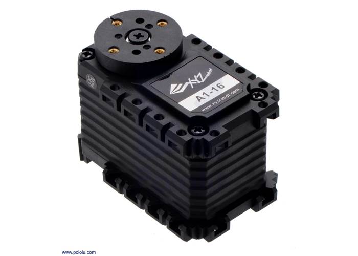 The A1-16 smart servo from XYZrobot is specifically designed for applications that require a lot of strong and complex actuation, such as humanoid robots, hexapod robots, and robotic arms. These are the same servos that are used in the Bolide Y-01 Advanced Humanoid Robot, also from XYZrobot. Unlike common RC hobby servos, these servos are capable of 360° continuous rotation while still offering position control over an effective range of 330°. They feature a TTL serial interface that is used to configure and control the servo and get feedback about position, speed, and temperature. Multiple servos can be daisy-chained on the same serial bus. Each servo also features a four-colour LED on the bottom that provides status feedback, making it possible to quickly determine if one or all servos in the chain are experiencing a problem.