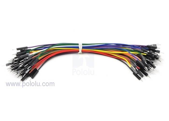 These premium jumper wires are stranded 26 awg wires with male terminations on both ends, for use with 0.1” (2.54 mm) headers and breadboards. The assortment of 12" (30 cm) wires includes five each of ten different colors.