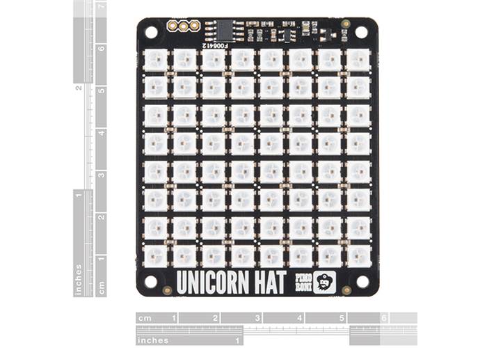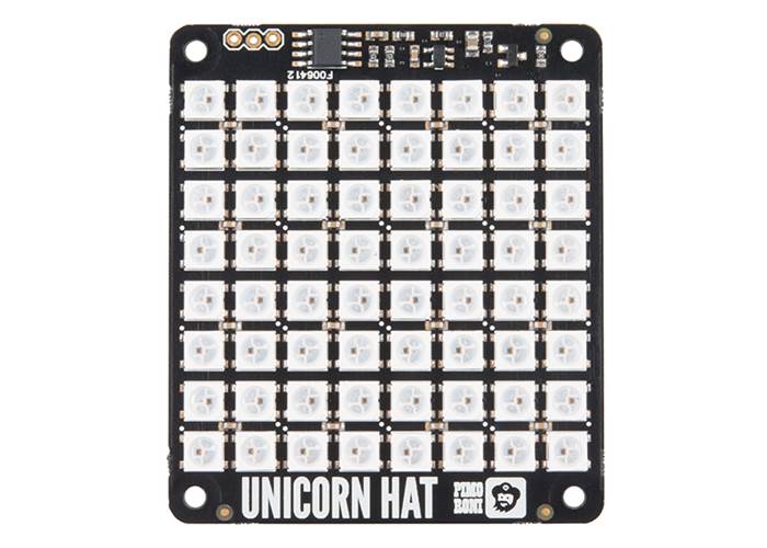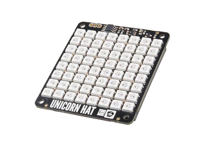 The Pimoroni Unicorn HAT is a “shield” for the Raspberry Pi that sports a matrix of 64 (8 x 8) addressable RGB LEDs that are powered directly from the Pi.