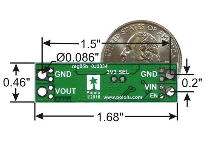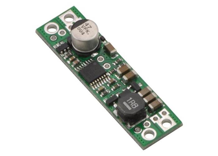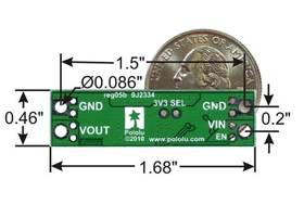 The compact (1.68"×0.46") D15V35F5S3 switching step-down (or buck) voltage regulator takes an input voltage between 4.5 and 24 V and efficiently reduces it to a lower, user-selectable voltage. The selectable output voltages are 5 and 3.3 V, and it can deliver up to 3.5 A continuous in typical applications.