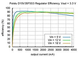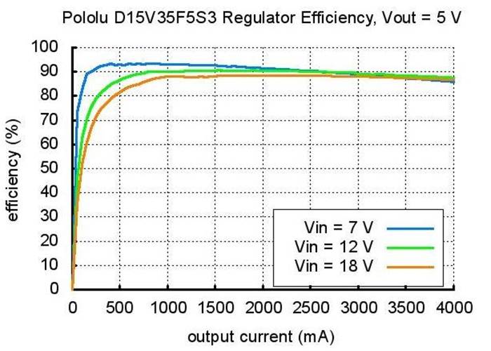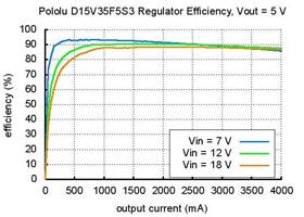 The efficiency of a voltage regulator, defined as (Power out)/(Power in), is an important measure of its performance, especially when battery life or heat are concerns. As shown in the graphs below, this switching regulator typically has an efficiency of 85 to 95%. For example, when regulating 12 V to 5 V with an output current of 1.8 A, the efficiency is above 90%. Since the output power is (Output current)×(Vout) = 1.8 A × 5 V = 9 W, the input power will be a bit under 10 W, with a bit under 1 W of heat dissipated in the regulator. The input current can then be calculated as 10 W/12 V = 0.83 A. This is far better than a linear voltage regulator, which would require an input current of 1.8 A and 22 W, wasting 13 W instead of the 1 W lost in this switching regulator.