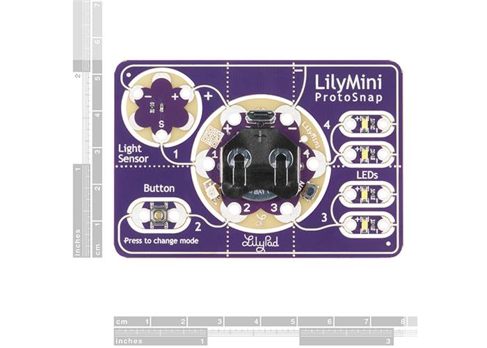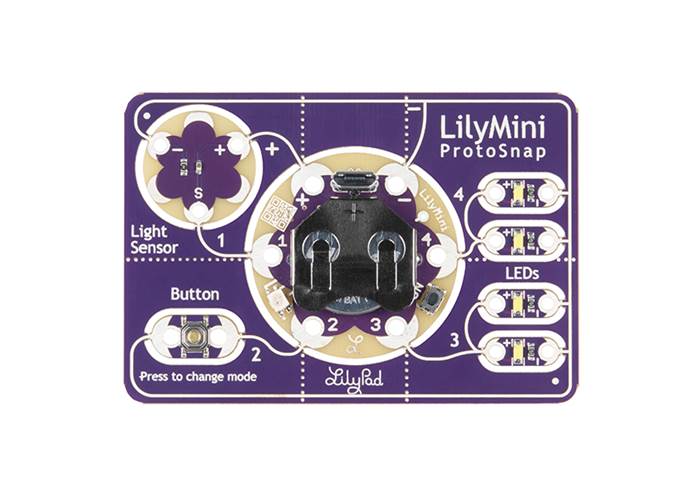 The LilyMini ProtoSnap is a great way to get started learning about creating interactive e-textile circuits before you start sewing. Like other LilyPad ProtoSnap boards, the LilyMini ProtoSnap has all of its pieces wired together out of the box, enabling you to test the circuit’s function before you sew. At the centre of the board is a pre-programmed LilyMini microcontroller connected to a LilyPad Light Sensor, LilyPad Button and two pairs of LilyPad LEDs.