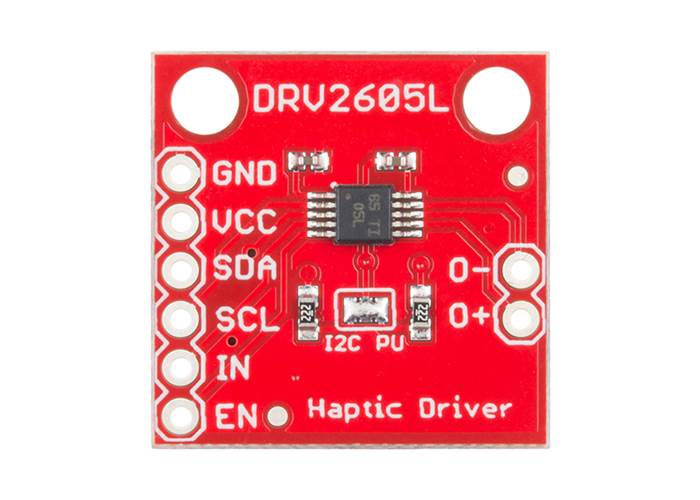The SparkFun Haptic Motor Driver breakout board features six pins to provide power to the sensor and I2C bus. Additionally, a microcontroller that supports I2C is required to communicate with the DRV2605L and relay the data to the user by means of vibration.