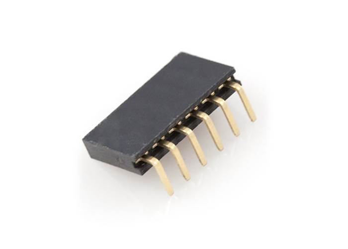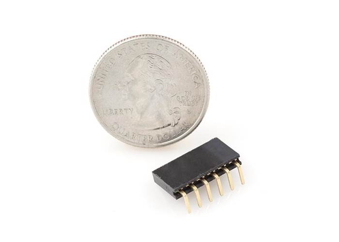 This is a through-hole 6-pin right-angle female header. We use this header on our FTDI Basic Breakout boards, and it connects perfectly with the 6-pin male header on Arduino Pros and LilyPad Main Boards.