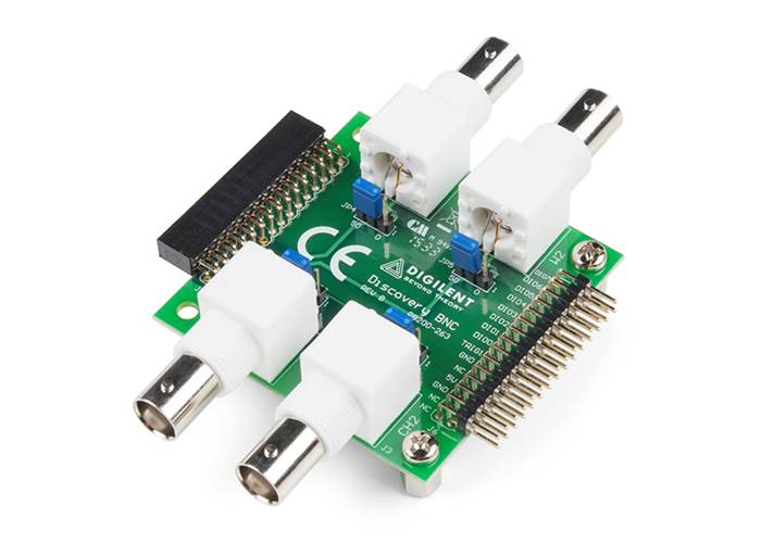 The Digilent BNC Adaptor Board is a simple add-on board intended to be used with the Digilent Analogue Discovery 2, which allows you to use standard BNC-terminated test leads and probes with your pocket-sized oscilloscope.