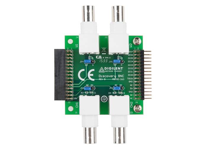The Digilent BNC Adaptor Board is a simple add-on board intended to be used with the Digilent Analogue Discovery 2, which allows you to use standard BNC-terminated test leads and probes with your pocket-sized oscilloscope. The adaptor board provides BNC terminations to each of the two oscilloscope channels and enables you to AC couple or DC couple signals to the oscilloscope in the Analogue Discovery.