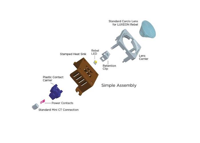 These LEDs can get toasty; you may want to consider adding some form of heatsinking to them. In addition to the heatsink, we also carry a lense and lense carrier specific to the rebel LEDs. Those components are all part of a solderless LED holder, they all snap together and really simplify the connection to these LEDs.