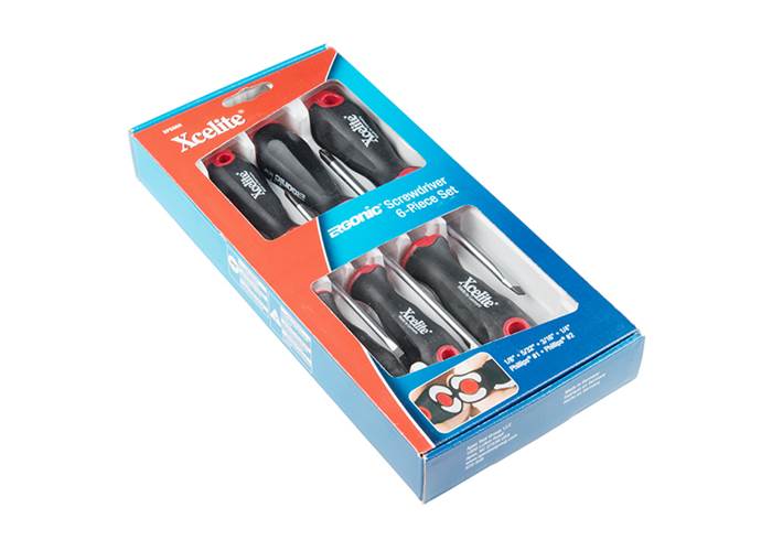 The Xcelite Ergonomic Screwdriver Set provides six different screwdrivers, each featuring a shockproof ergonomic soft inner core and handle.