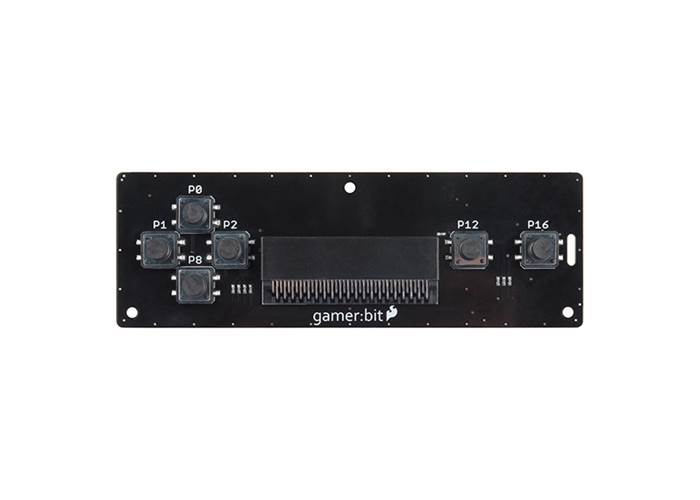 The gamer:bit connects to the micro:bit via an edge connector in the centre of the board, making setup easy. This creates a handy way to swap out micro:bits for programming, while still providing reliable connections to all of the different pins on the micro:bit. We have also included several poke home connectors on the back of the board that correspond to each button on the gamer:bit, allowing you to use external parts to control your game!