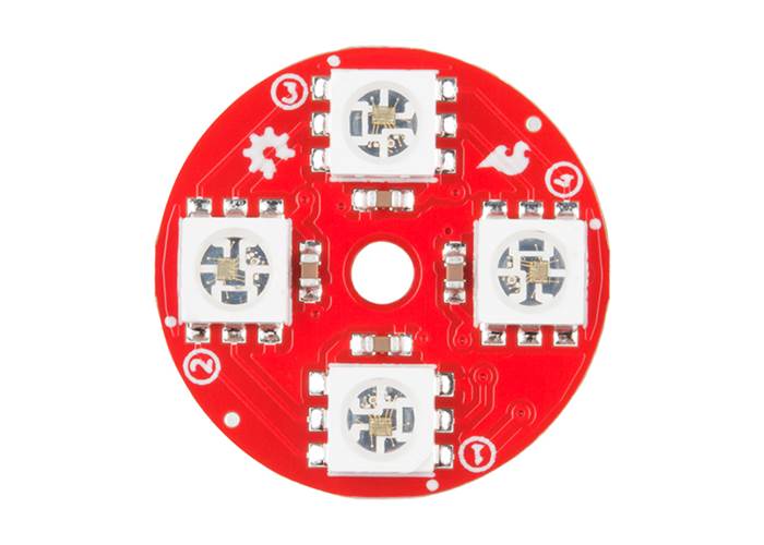 Designed to give your projects an edge in their lighting capacity, the SparkFun Lumenati 4-pack is a coin-sized board equipped with four APA102C LEDs surrounding the outer edge. The 4-pack board can be daisy-chained with other Lumenati boards, thanks to the multiple SMD pads on the back allowing for multiple design options and formations. Additionally, we have labelled the APA102C LEDs on each board with numbers indicating their position in the sequence to help you write code more easily. We especially love using the Lumenati boards to give our flying race drones a bit of style and panache.