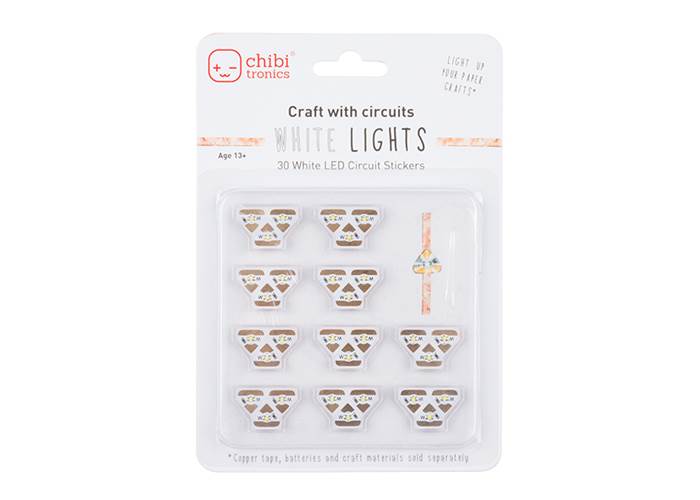 Brighten up your projects with this MegaPack of circuit stickers. This LED sticker pack from Chibitronics is a set of 30 individual white LEDs that offers a conductive adhesive backing that can be attached to just about any surface and powered by a simple coin cell battery.