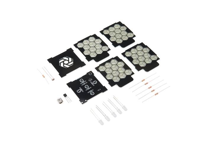 Every Night Light kit includes housing and base PCBs, five white LEDs, resistors, a mini photocell, an NPN transistor, and an SMD USB power connector. All you need to supply (besides a soldering iron and solder) is a micro USB cable since it is not included. We do recommend taking your time assembling this kit as you will need patience to make sure the design-cut PCB housing is assembled correctly.