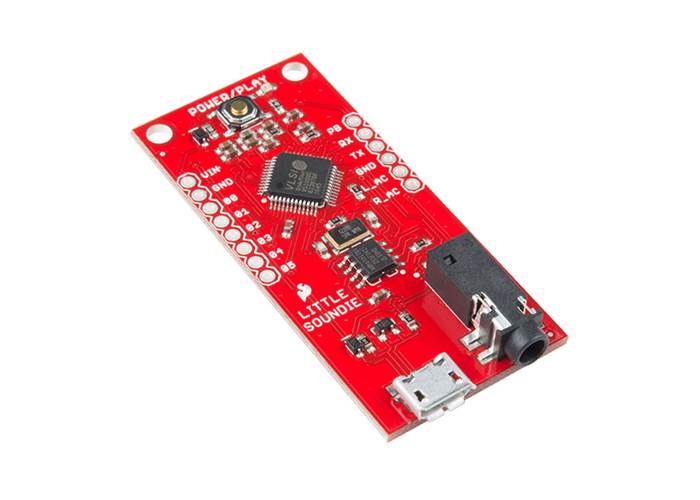 The SparkFun Little Soundie is a fun and easy-to-use audio playback device breaking out the VS1000D audio codec IC allowing this little board the ability to decode OGG Vorbis and WAV type files. The Little Soundie makes adding sound effects to your project, prop, or costume easy with the built-in USB mass storage for your audio files and simple methods of triggering audio playback. Beyond playing back your chosen audio files, the Little Soundie is remarkably easy to set up, with just four simple steps: connect to your computer using a micro-USB cable, press the power/play button, format the disk when prompted, then just drag and drop your .ogg or .wav files!