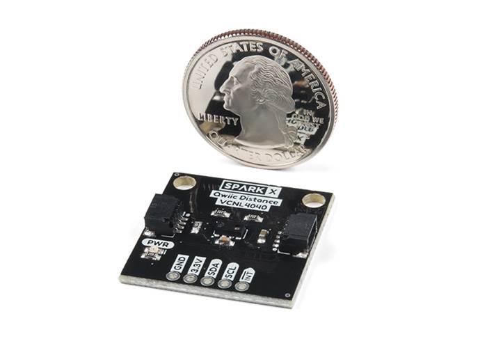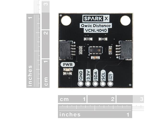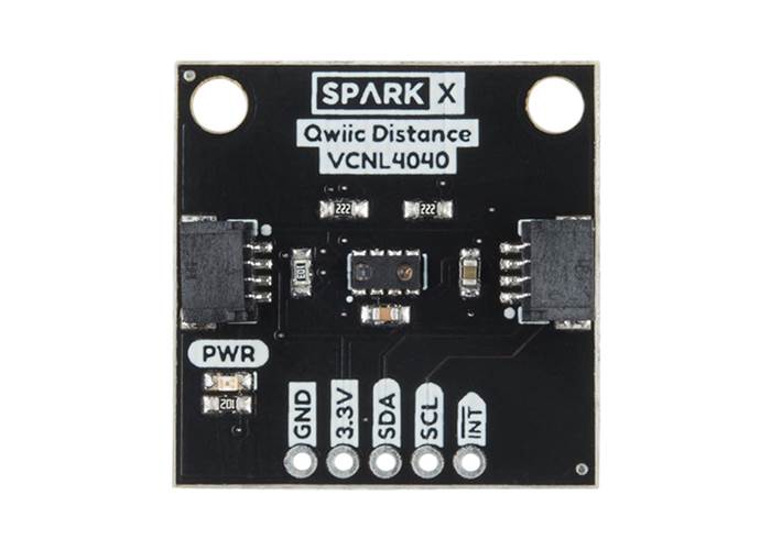 The VCNL4040 is a simple IR presence and ambient light sensor. This sensor is excellent for detecting if something has appeared in front of the sensor. We often see this type of sensor on automatic towel dispensers, automatic faucets, etc. You can detect objects qualitatively up to 20cm away. This means you can detect if something is there, and if it is closer or further away since the last reading, but it’s difficult to say it is 7.2cm away. If you need quantitative distance readings (for example sensing that an object is 177mm away) check out the SparkFun 2 meter and 4 meter Time of Flight (ToF) sensors with mm accuracy.